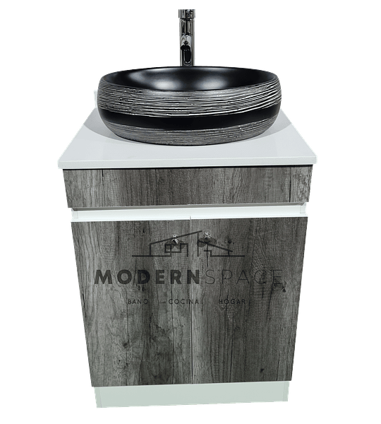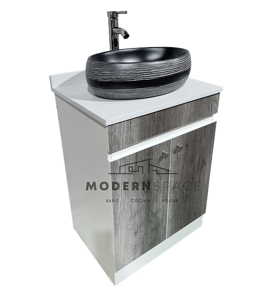 Vanitorio MDF Gris con cubierta de Cuarzo, Lavamanos sobre poner y griferia.